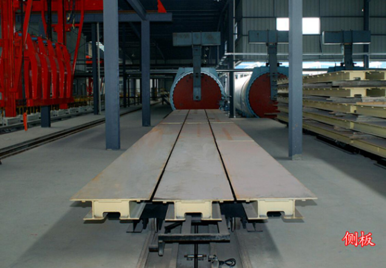 经过翻转吊具脱模后,侧板承载加气砖,切割进釜蒸养直至包装工段。