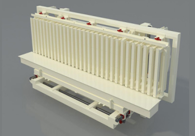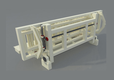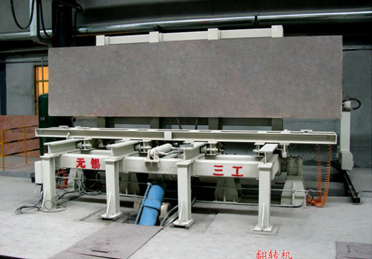 坯体切割底面会有一些废料。翻转台将坯体在翻转架上转过90°后,坯体底面切割的表皮由水平位置转变成垂直位置,在重力作用下,自动脱落,坯体表面废料被去除。翻转台全部采用液压驱动。翻转油缸还具有终点缓冲性能。为了保证蒸养底板、侧板在翻转过程中的稳固性,在它们处于翻转位置时侧面都设有锁紧机构。